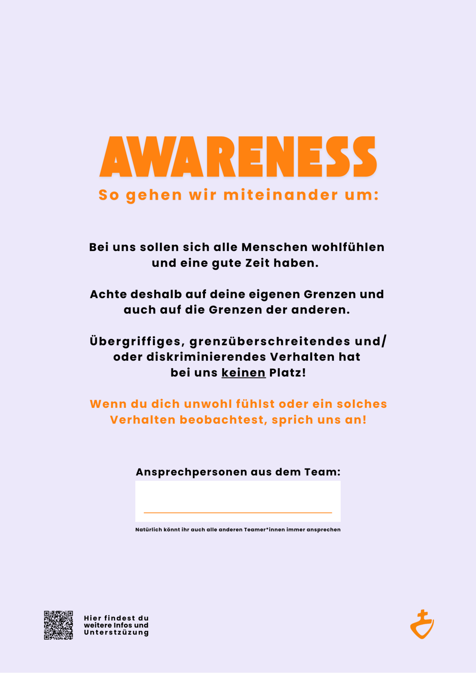 Das ist ein Plakat mit Verhaltensregeln, dass du für Freizeiten und Veranstaltungen nutzen kannst. Es verdeutlicht wie wir miteinander umgehen wollen und soll dazu beitragen, dass sich alle wohlfühlen.